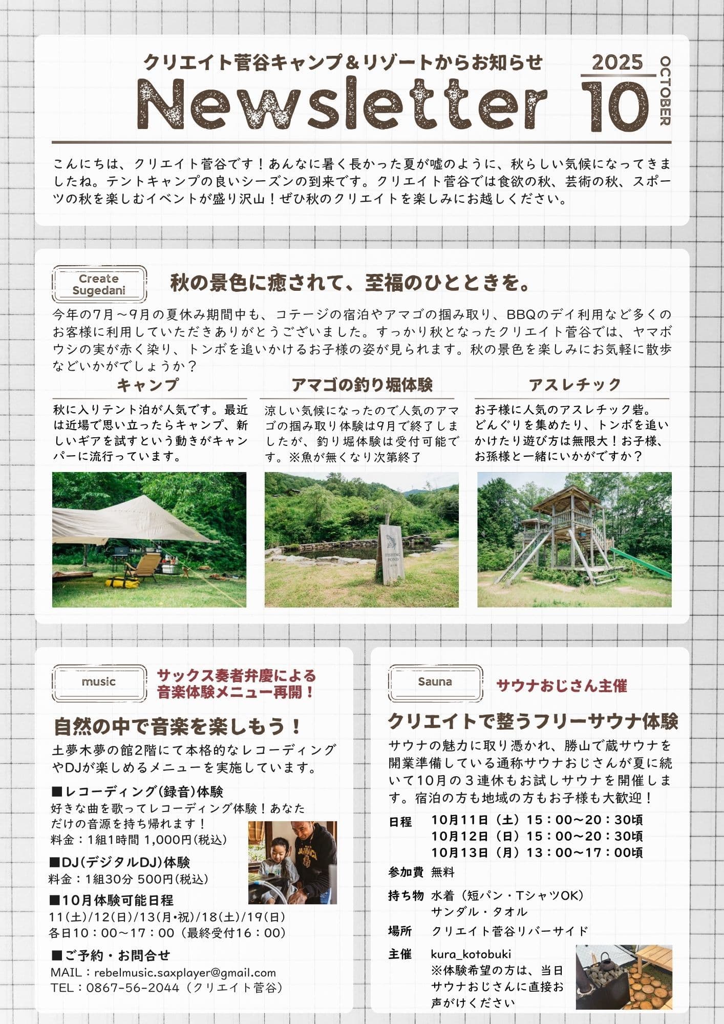 いつもクリエイト菅谷をご利用いただきまして、誠にありがとうございます。本年度より前任者より担当を代わり、お客様により良いアウトドアライフを過ごしていただけるようサービス等の充実を図っていきたいと考えております。まずは基本的なキャンプ場としてのコンセプトを一新させております。