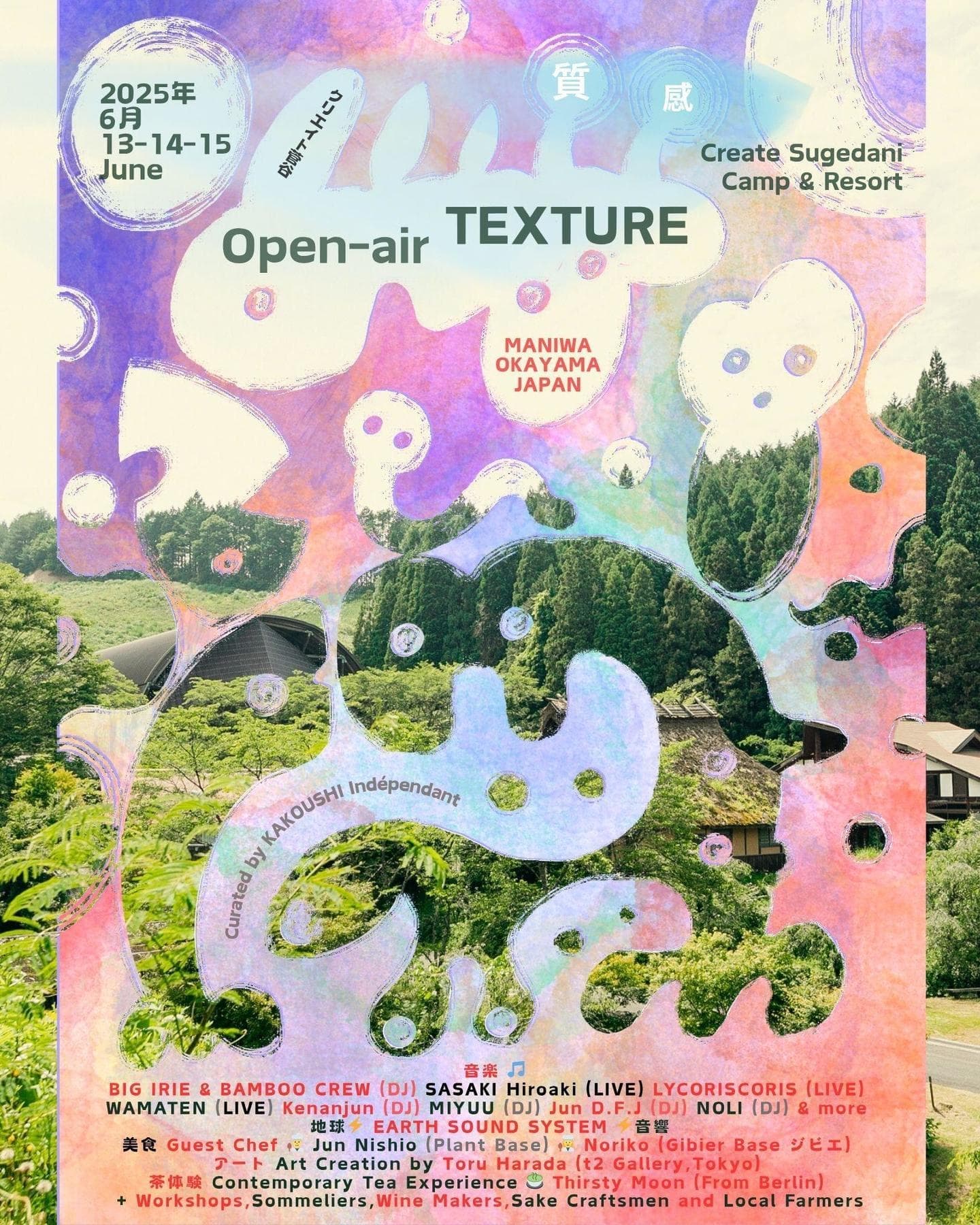 Located at Mikamo, Maniwa City, Okayama Prefecture, this campground is surrounded by clear streams and forests. Musicians, DJs, artists, chefs, food producers, brewers, and tea masters will unite to offer cultural experiences that engage all five senses. Attendees can immerse themselves in both tangible and intangible “textures,” fostering joy and connection.