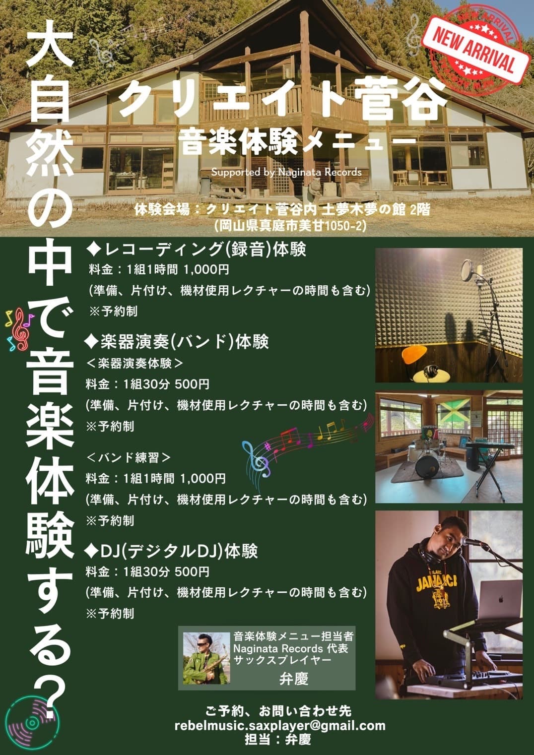 いつもクリエイト菅谷をご利用いただきまして、誠にありがとうございます。7月から真庭地域おこし協力隊でサックスプレイヤーの弁慶さんによる様々な音楽体験メニューが始まります。プロのミュージシャンの元、大自然の中で音楽を楽しんでみませんか?
