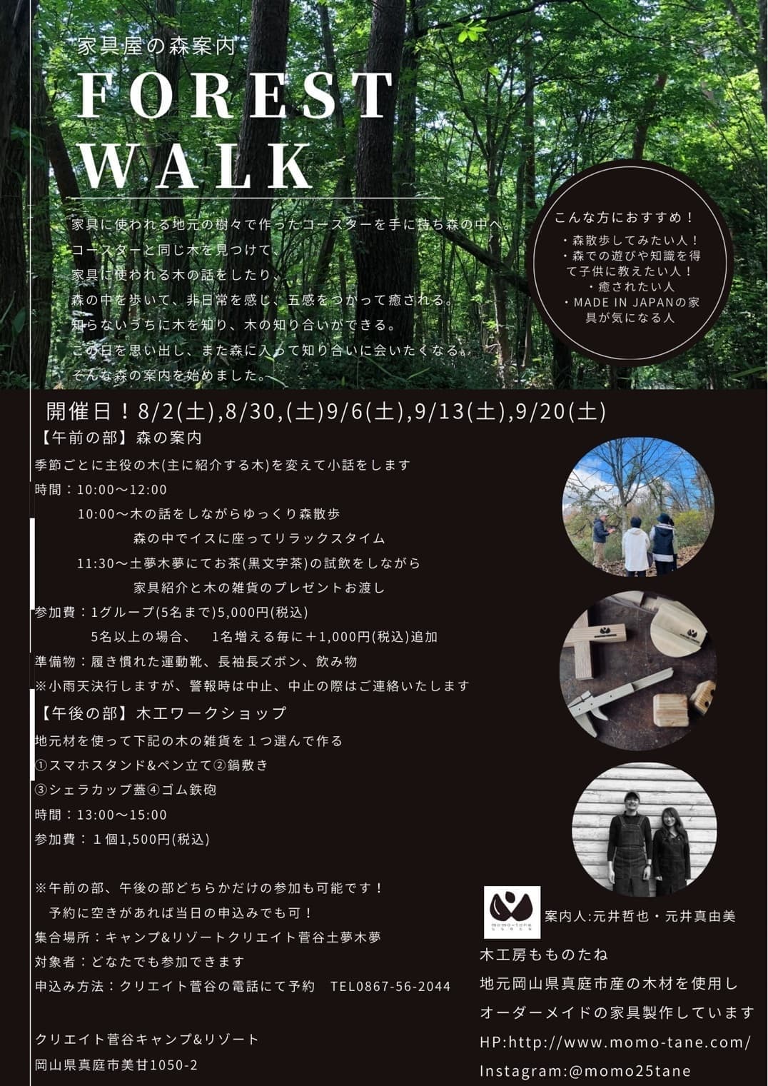 いつもクリエイト菅谷をご利用いただきまして、誠にありがとうございます。8月から木工房もものたねさんによる森と木にまつわるWS。クリエイト内の山を散策。地元材を使った木工ワークを行います。